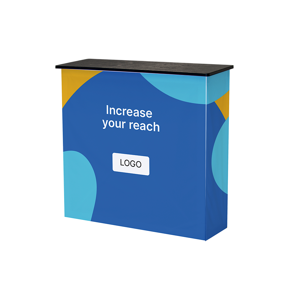 Maak een blijvende indruk op uw volgende beurs of evenement met onze mobiele beursbalie (ook wel beursbalie, counter of desk genoemd). Deze balie is niet alleen een blikvanger, maar biedt ook de perfecte combinatie van functionaliteit en design. Onze beursbalie is verkrijgbaar als complete set, inclusief zwart topblad en legplank, of u kunt kiezen voor losse onderdelen zoals alleen het bedrukte baliedoek of een los systeem.
